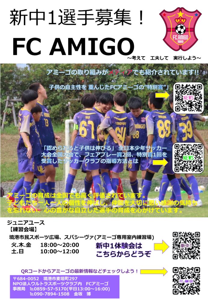 【問合せ先】FCアミーゴ ジュニアユース監督(事務局) 金坂 博(カネサカ ヒロシ)